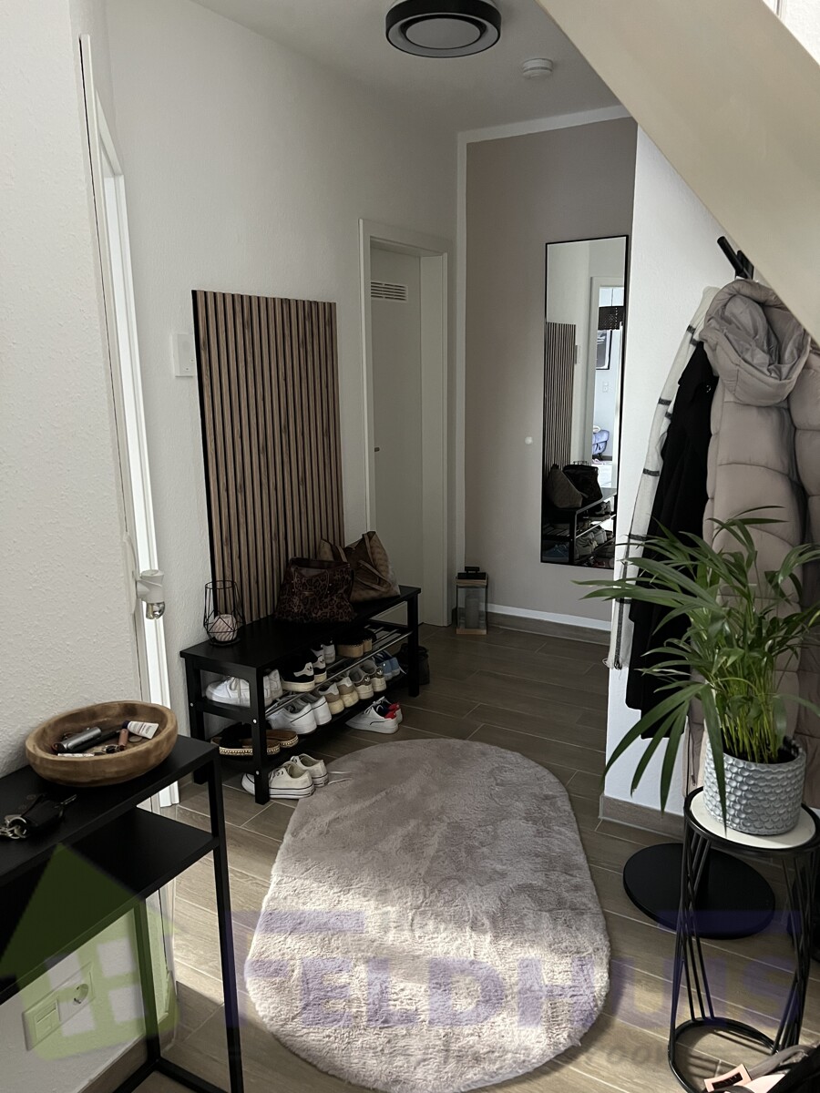 Diese ist wie folgt aufgeteilt: Flur, Badezimmer, Schlafzimmer, offener Wohn- und Küchenbereich, Abstellraum und einem ausgebauten Spitzboden mit einem Flur und einem weiteren Schlafzimmer.